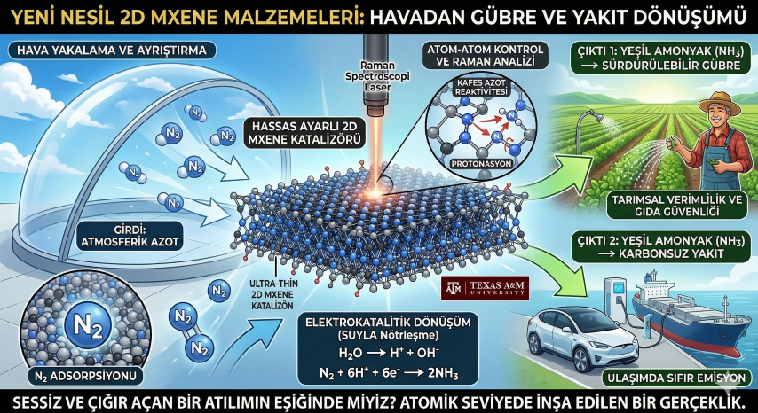 Teksas A&M Üniversitesi’ndeki bu keşif; hava gibi her yerde bulunan, sınırsız bir kaynağın gelişmiş 2D materyaller aracılığıyla küresel enerji ve gıda krizine çözüm sunduğu bir geleceğin kapılarını aralıyor. Görünmez atomların hassas dansını moleküler düzeyde kontrol edebildiğimiz bu yeni dönem, endüstriyel kimyanın gezegenimizle kurduğu dengeyi baştan yazabilir.