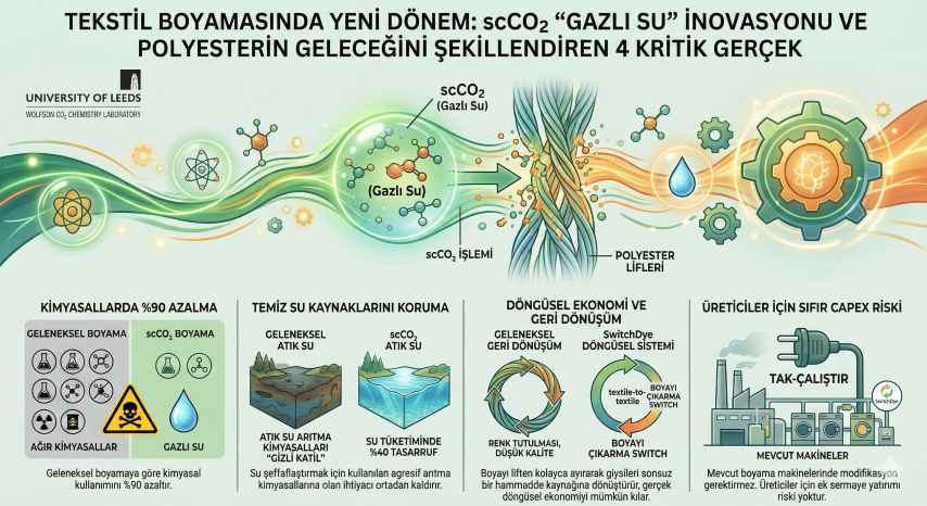 Ancak Leeds Üniversitesi bünyesindeki Wolfson CO₂ Kimya Laboratuvarı’ndan doğan SwitchDye teknolojisi, bu kronik endüstriyel soruna mühendislik harikası bir yanıt veriyor: “Gazlı su”. Sektörün alışılagelmiş ağır kimyasal reçetelerini bir kenara iten bu inovasyon, sürdürülebilir modayı soyut bir pazarlama söyleminden çıkarıp somut bir endüstriyel standarda dönüştürmeyi hedefliyor.